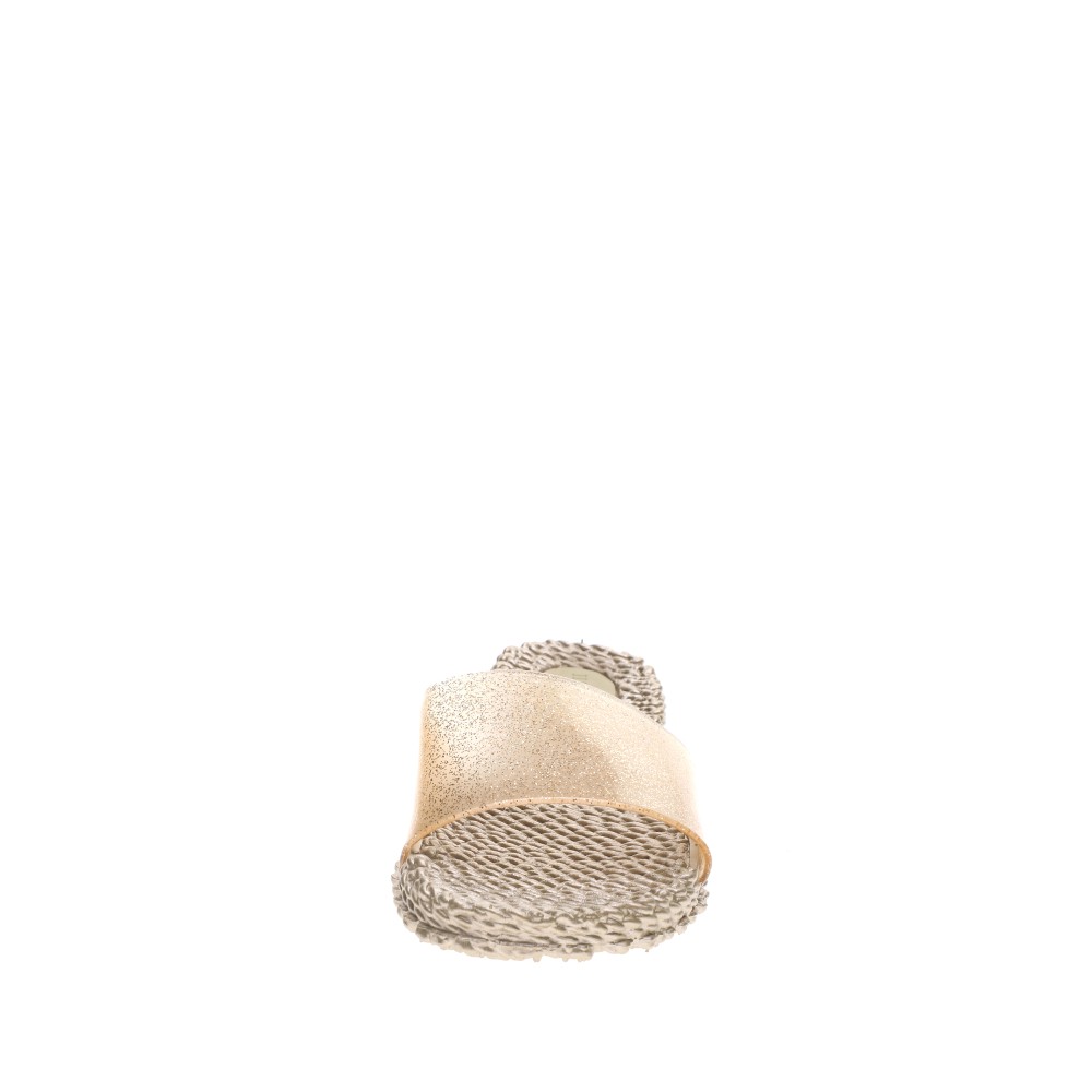 Γυναικεία slides της εταιρείας ILSE JACOBSEN σε χρυσή απόχρωση. Κατασκευασμένες από PVC με πλεκτή όψη, είναι κομψές και ανθεκτικές. Λουράκι με glitter για extra λάμψη. Το απαραίτητο καλοκαιρινό αξεσουάρ, που θα λατρέψετε